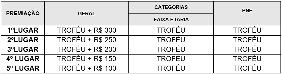 6.2. Serão premiados com troféus as 5 primeiras colocadas geral e as cinco primeiros colocadas na faixa etária e as cinco primeiras colocadas da categoria PNE.