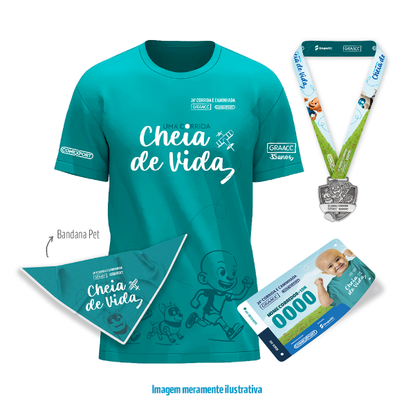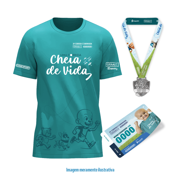 Sacola Kraft, 01 Camiseta Adulto, 01 Camisetas Infantil, 02 Números de Peito Especiais "Corra por mim" e 02 Medalhas (Pós Prova).