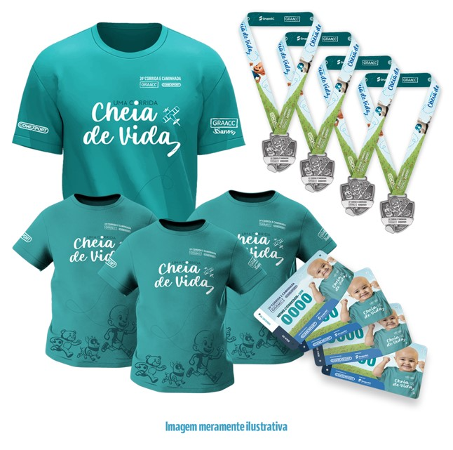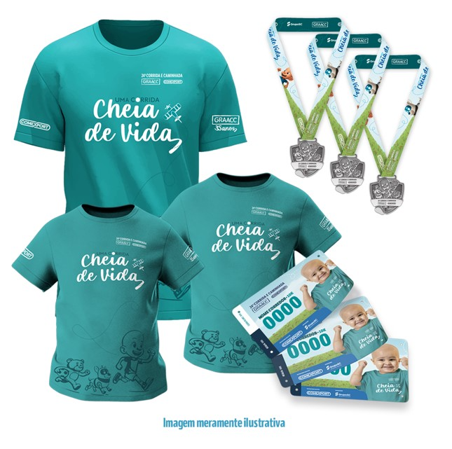 Sacola Kraft, 01 Camiseta Adulto, 03 Camisetas Infantis, 04 Números de Peito Especiais "Corra por mim" e 04 Medalhas (Pós Prova)