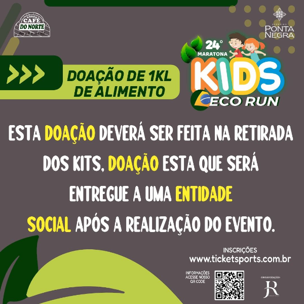 🎈 Atividades recreativas e brincadeiras🍔 Área gourmet🎤 Animação🎁 Sorteios de brindes🌿 Proposta ecológica do evento (Corrida Ecológica)🥫 Doação social obrigatória de 1kg de alimento na retirada do kit (destinado a entidade social após o evento) ❤️📣 Canais oficiais:📸 Instagram: @maratonakidsoficial | https://www.instagram.com/maratonakidsoficial/📲 WhatsApp: (92) 98124-0910📧 E-mail: jaqueline_remigio@hotmail.com👩💼 Coordenação do Evento: Jaqueline Remígio🏷️ Maratona Kids – Corrida da Alegria🧾 CNPJ: 60.833.268/0001-36📍 Endereço: Rua Rafael Assayag, nº 112 – Alvorada – CEP 69043-130 – Manaus/AM📸 Divulgação: uso de imagem (foto/vídeo) autorizado pelos responsáveis no ato da inscrição para divulgação do evento e ações de marketing