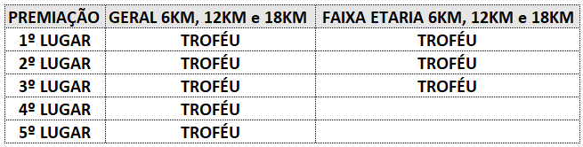 6.2. Serão premiados com troféus os cinco primeiros colocados no masculino e feminino geral e os três primeiros colocados no masculino e feminino de cada categoria.