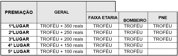 6.2. Serão premiados com troféus os cinco primeiros colocados no masculino e feminino geral e os cinco primeiros colocados no masculino e feminino de cada categoria de acordo com o quadro abaixo: