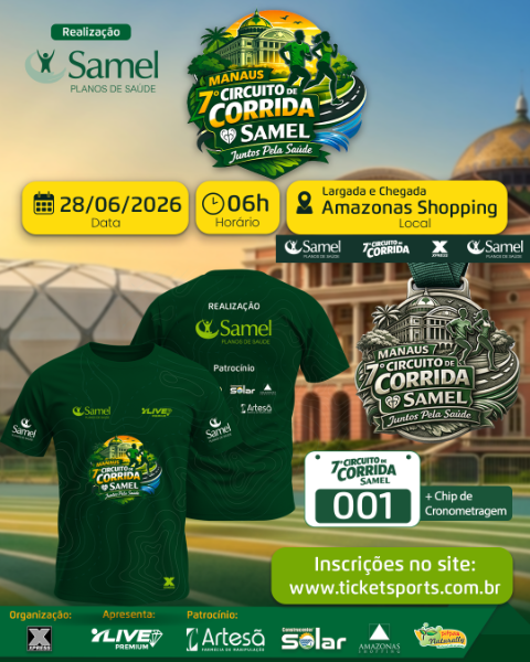 📅 Data: 28 de junho de 2026 (domingo)📍 Cidade/UF: Manaus/AM🎯 Objetivo: incentivar hábitos saudáveis e a prática de atividade física, reforçando a importância da saúde como um todo, com ênfase especial na 🧠 saúde mental.📌 Local (largada e chegada): Amazonas Shopping – Manaus/AM⏰ Horários de largada:• 06h00 – Deficientes Visuais e Cadeirantes (Masculino e Feminino)• 06h05 – Pelotões de Elite e Geral (5 km e 10 km – Masculino e Feminino)🕐 Recomendação: chegar com pelo menos 1 hora de antecedência.⏳ Tempo máximo do evento: 2 horas💧 Hidratação: 6 postos de hidratação com água mineral ao longo do percurso🩺 Segurança/saúde: haverá atendimento médico e ambulância; atendimento de retaguarda via rede pública; recomenda-se avaliação médica e teste ergométrico antes da prova.
