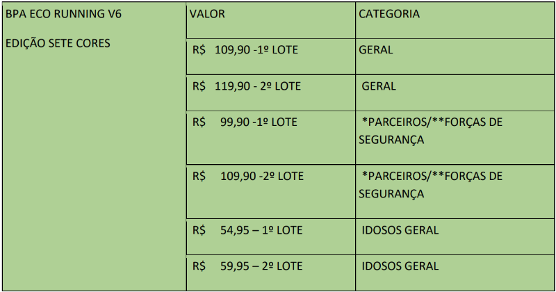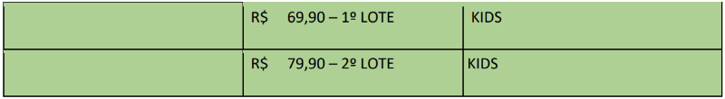 As inscrições serão realizadas ON LINE, no site da empresa prestadora de serviço de inscrições Ticket Sports, e só serão devidamente efetivadas após a CONFIRMAÇÃO DO PAGAMENTO. No site haverá lista de inscritos geral, disponível para o público apenas para inscrições realizadas ON LINE conforme os valores abaixo.