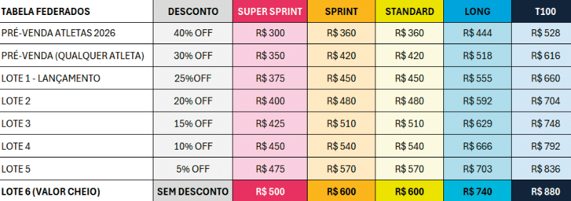 - Baixa renda (Cadastro Único): inscrições gratuitas até o limite de vagas destinadas a esta categoria, válidas apenas para Super Sprint, Sprint e Standard. Após atingir o limite, desconto de 50% sobre o valor base do lote final.