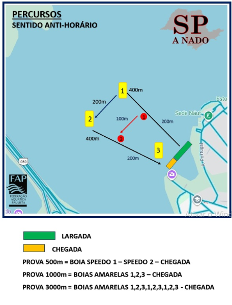 As provas são divididas em três distâncias: 500 m, 1.000 m e 3.000 m, realizadas em percursos monitorados na Represa Billings.