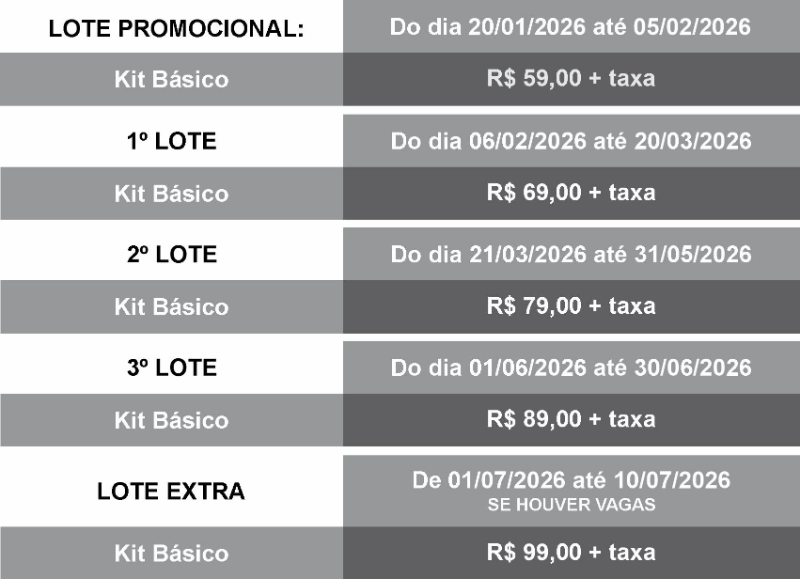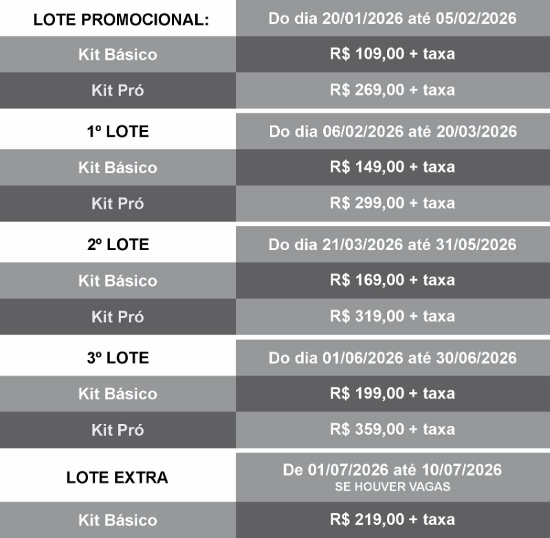 - PRO: Numeral / Chip / Medalha / Bolsa / Boné / Camisa casual