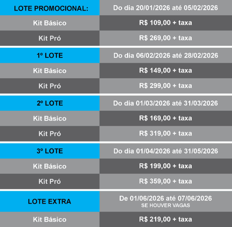 - PRO: Numeral / Chip / Medalha / Bolsa / Boné / Camisa casual