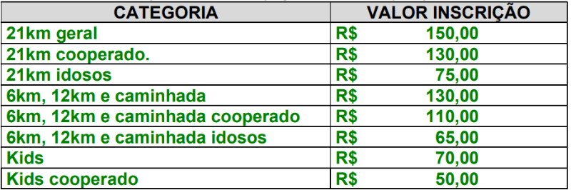 A corrida será disputada nas categorias Kids, 6km (corrida/caminhada), 12km e 21km, com duração máxima de 2h e 50min no total. Para o atleta que irá competir na categoria 21km, o tempo de corte para CUMPRIR os 7 km iniciais será de 1h, para que a organização do evento cumpra o prazo dados pelos órgãos que autorizam o uso do solo para o evento. Após o tempo determinado para corte, os atletas serão convidados a abandonar o percurso e retornar ao local da largada, para que tenham total segurança no trajeto estabelecido para o evento.