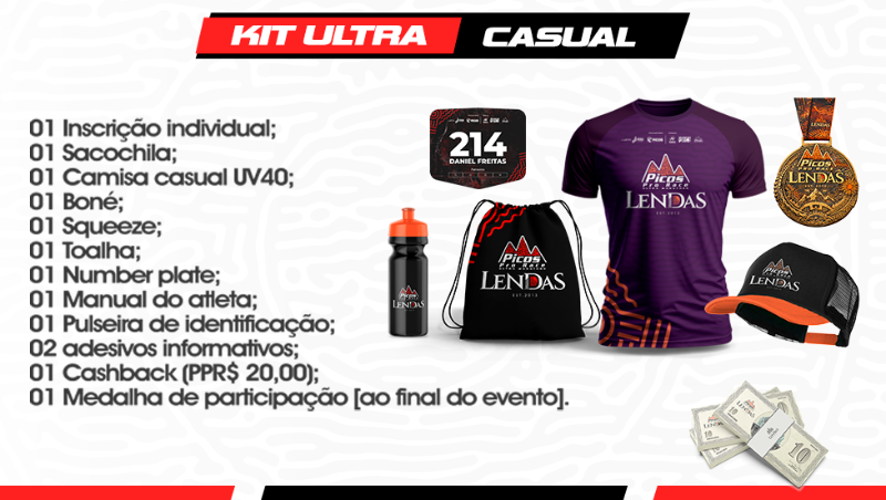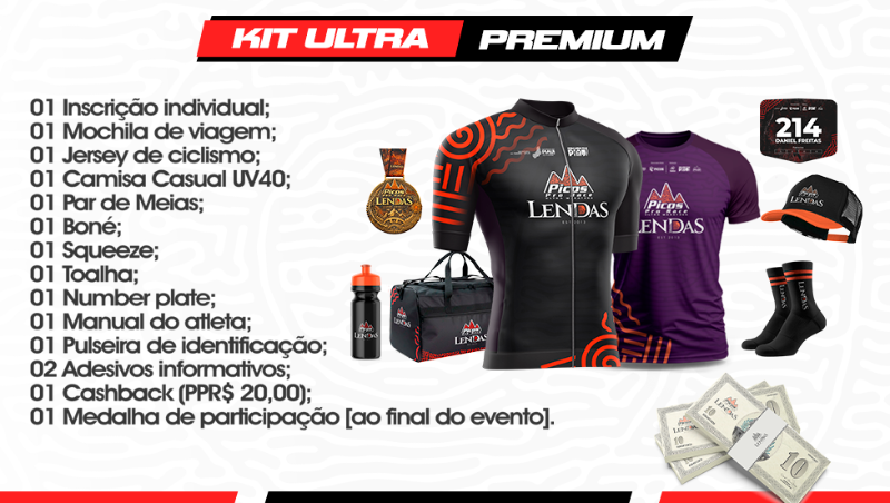 Todos os kits incluem número do atleta, medalha de participação, manual do atleta, adesivos e brindes. O Kit Premium inclui jersey de ciclismo, mochila, camisa casual, squeeze e brindes exclusivos.